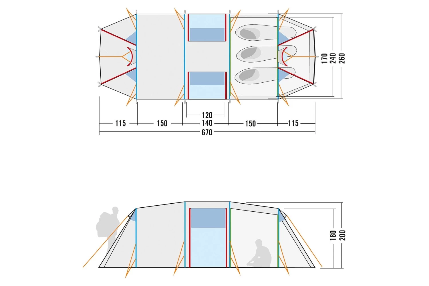 Komfortables Familienzelt mit extra-großer Apsis. Mit einer Gesamtlänge von 6,70 Meter und der stehhohen Konstruktion ist das Family Trek II eine echte Luxusbehausung. Es bietet eine geräumige Schlafkabine für drei Personen und einen äußerst großzügig bemessenen Vorraum, dazu zwei zentrale, gegenüberliegende Eingänge sowie Eingänge an beiden Stirnseiten. In die Apsis kann eine zweite Schlafkabine für drei Personen (Art. 2436 Family Trek II Extension; separat erhältlich) eingehängt werden.