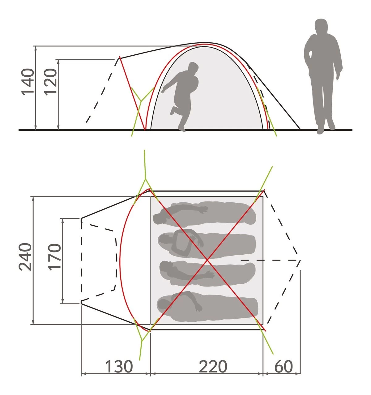 • Außenzelt: 100% Polyester; 75 D Polyurethane coated 3.000 mm;